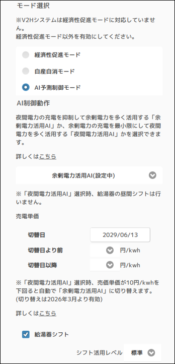 ※初期設定は従来のAI予測制御モードである「余剰電力活用AI」です。