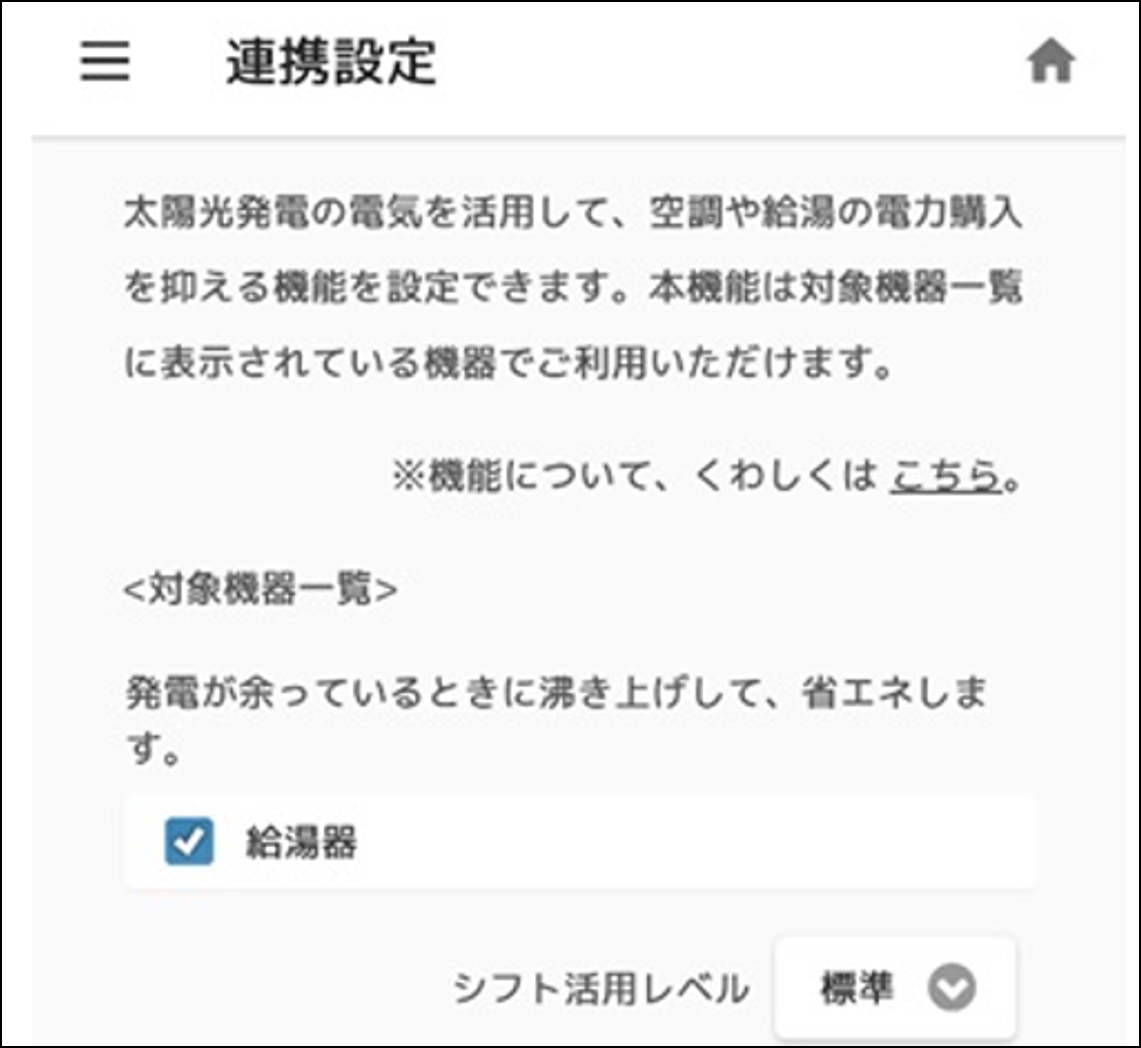 「ソーラー家電連携(HEMS)」を有効にしていると、太陽光発電の発電が余っているときに、発電を活用して給湯器の沸き上げをします。給湯器は、エコキュートとハイブリッド給湯器が対象です。