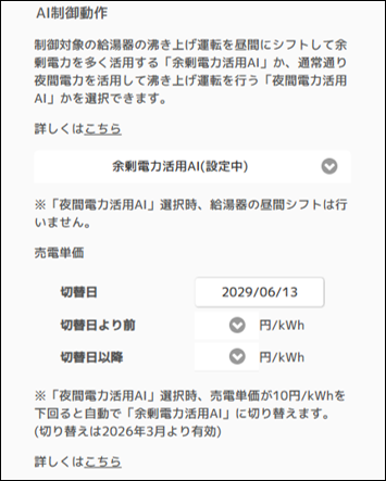 なお、入力した切替日に売電単価<夜間電力単価となるので、自動的に「余剰電力活用AI」に切り替わります。