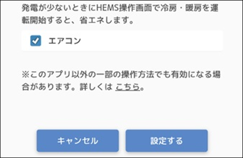 「ソーラー家電連携(HEMS)」を有効にしていると、HEMSの操作画面で「冷房」または「暖房」運転を開始することで、太陽光発電の余剰電力が少ないときに省エネ運転が動作します。余剰電力が多くなると、省エネモードを解除します。エアコン本体のリモコンから操作が行われると、本制御は終了します。